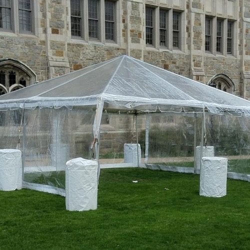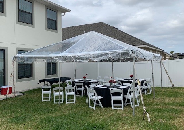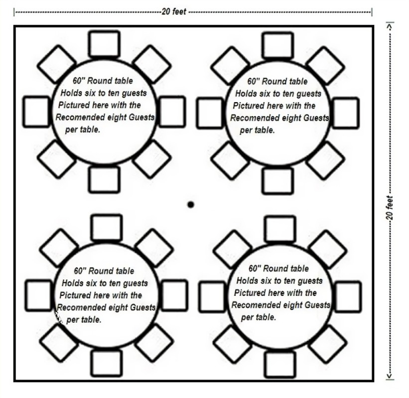 A 20 × 20 tent has enough space to accommodate up to 32 people comfortably. There are four tables that will fit under this size tent if you use 60-inch round tables. Each table easily accommodates 8 people, which is how we ended up with a total of 32 people. delivery fee is extra, side walls are extra and we also need to secure with cement or water barrels for an extra cost |