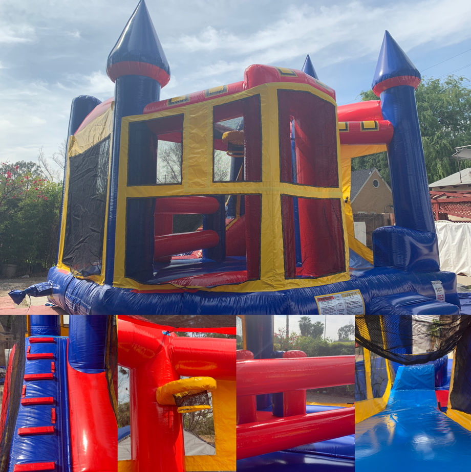 crawl through elements and of course a slide...this unit will keep the crowd entertained and busy all day long.The design of this inflatable castle is incredible. The extra large jumping area combines pop ups and crawl throughs to keep kids busy and entertained. The inside area is also large enough to allow those who want to dunk a ball through the hoop to do so. A few easy steps to climb takes the rider to the top of a gracious landing platform where they can sit and enjoy or slide down to a large landing area below. No steps or stairs delivery and extensions cords are an extra fee. |