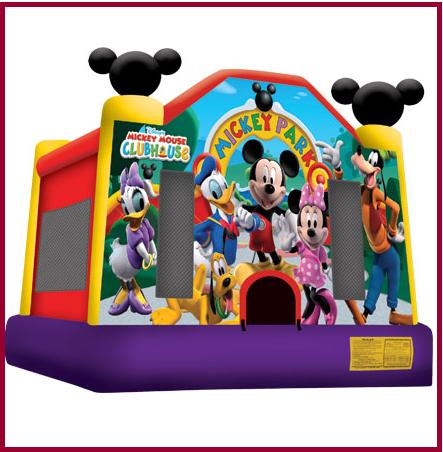 The licensed Mickey Park medium jump will inject your next party or event with a little club house fun, as Mickey and his pals invite everyone to the Mickey Mouse Club House! A pair of trademark, three-dimensional Mickey ears helps show the way, and sharp, colorful artwork make participants feel they're at Disney! This moonwalk features Mickey, Minnie, Daffy, Daisy, Goofy and the Mickey Mouse's faithful pup, Pluto, perfect friends for kids to jump alongside all day!. Rentals are for children 12 and under, not designed for teenagers and/or adults. Park prices are extra Extension cords are extra $5.00 more. |